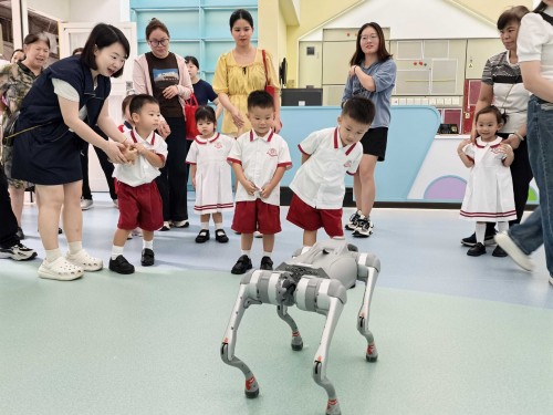 今天,身穿整齊校服的可愛學童在家長們不捨而期待的目光中,邁著稚嫩的步伐步入裝飾一新的校園。校園內外處處洋溢著濃厚的愛國與科技氛圍,教師帶著幼兒與機械狗進行近距離的接觸和認識,讓幼兒感受到科技在不斷創新發展。此外,老師更以生動活潑的方式為幼兒講解國家象徵的深刻內涵,在幼兒清澈的眼眸中播下愛國的種子。