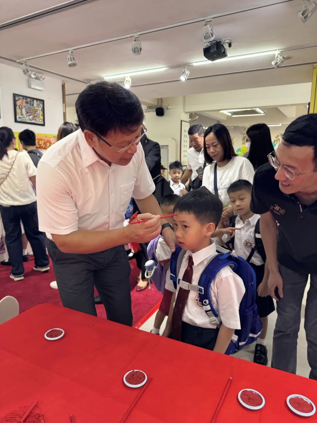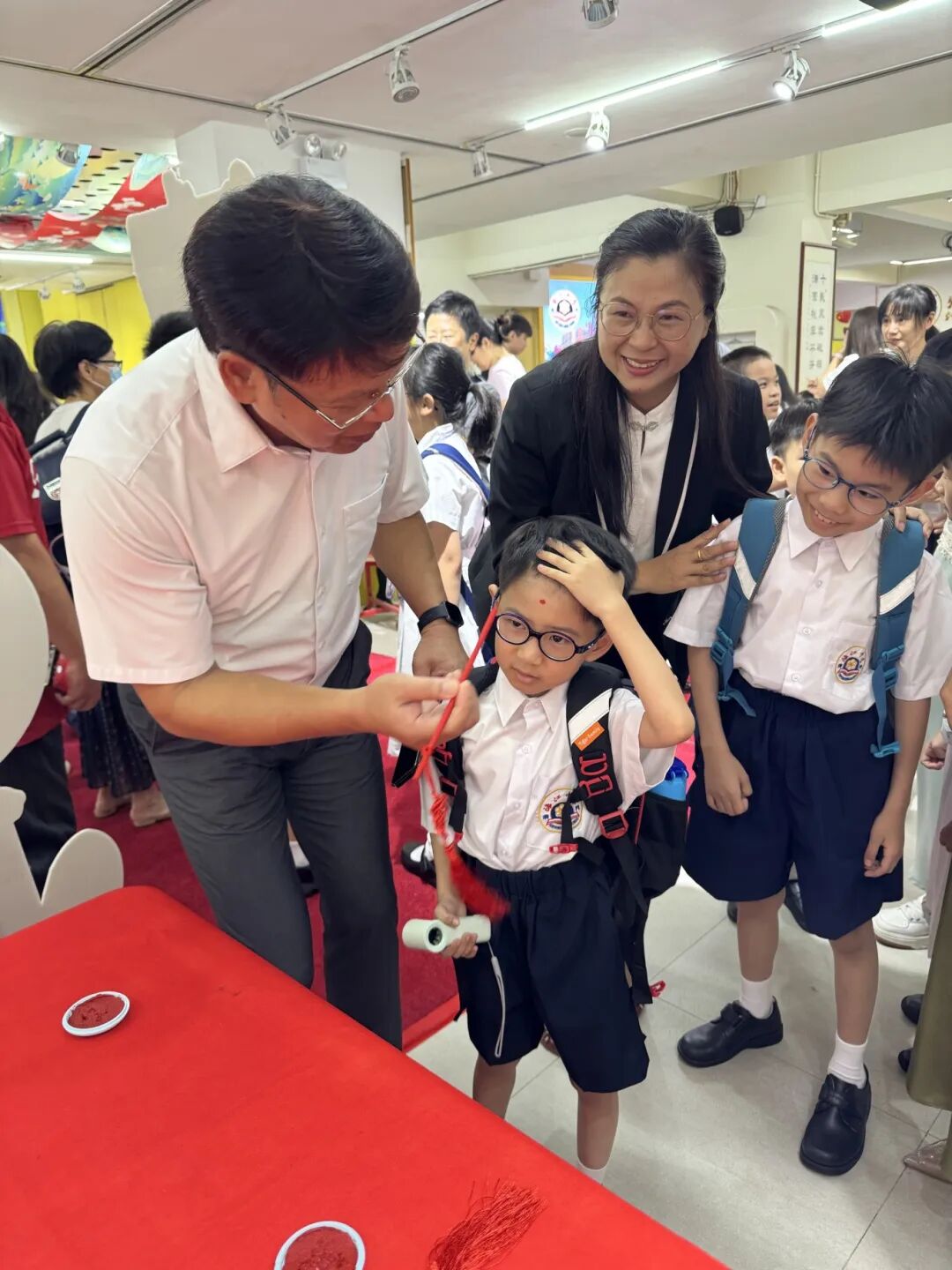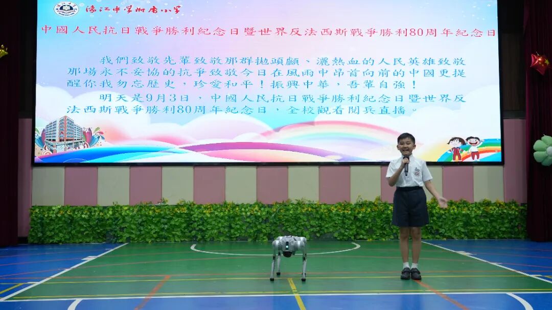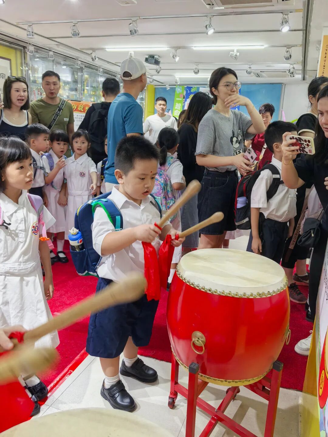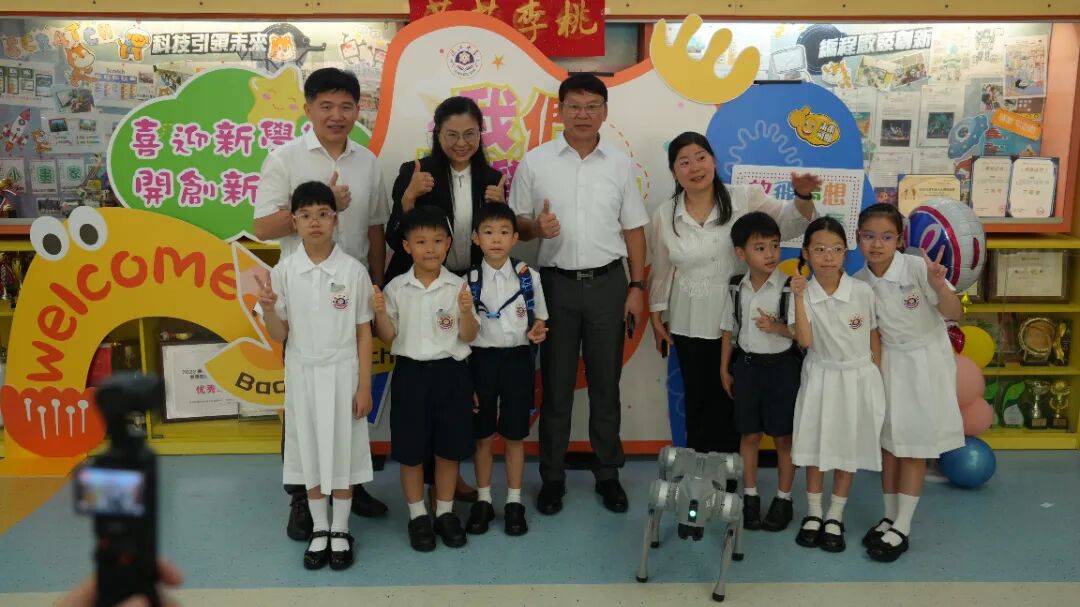 校門口,“朱砂啟蒙”與“鼓韻啟新”兩大特色環節率先點燃氛圍。老師用朱紅的朱砂在孩子們額頭點上“智慧痣”,寓意開啟智慧、點亮心燈;鏗鏘有力的鼓點陣陣響起,既傳遞著對新學年的美好期盼,也讓孩子們在傳統儀式中感受文化魅力,以飽滿精神邁入校園。走進校園大堂,各式開學主題拍照打卡位更成為亮點,佈滿生動圖案與暖心標語的打卡區,吸引同學們與家長駐足合影,用鏡頭定格開學的喜悅瞬間,讓校園處處充滿歡樂氣息。還展示了Unitree最新型機械狗“濠小一仔”,是希望讓同學們直觀感受科技魅力。“濠小一仔”這款機器人搭載了超感知系統和AI交互功能,未來可在编程教育、科學實踐中發揮重要作用。