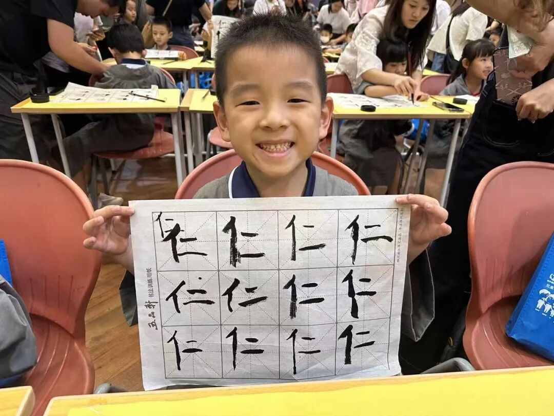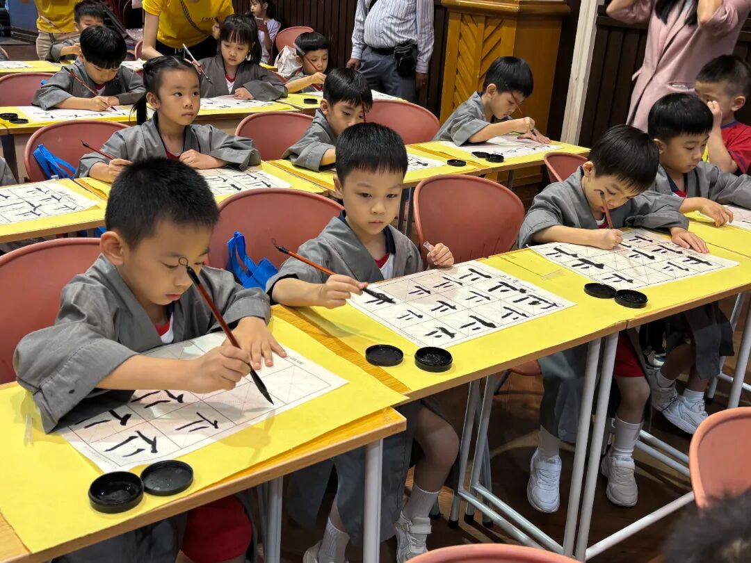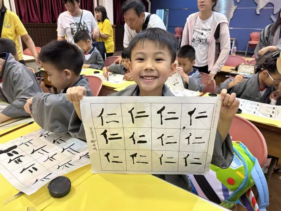 儀式核心環節,主禮嘉賓向濠小的學童們頒贈紀念毛筆,正式開啟他們的書寫啟蒙之路。在老師的指導下,學生手握毛筆初次描紅,專注地書寫內涵深邃的「仁」字,稚嫩的臉龐寫滿好奇,於一撇一捺間探尋漢字奧秘,領悟儒家「仁義禮智信」的精神內核與「堂堂正正做人」的深意。活動尾聲,濠小學童們自信展示毛筆作品,現場掌聲陣陣,氣氛熱烈溫馨。