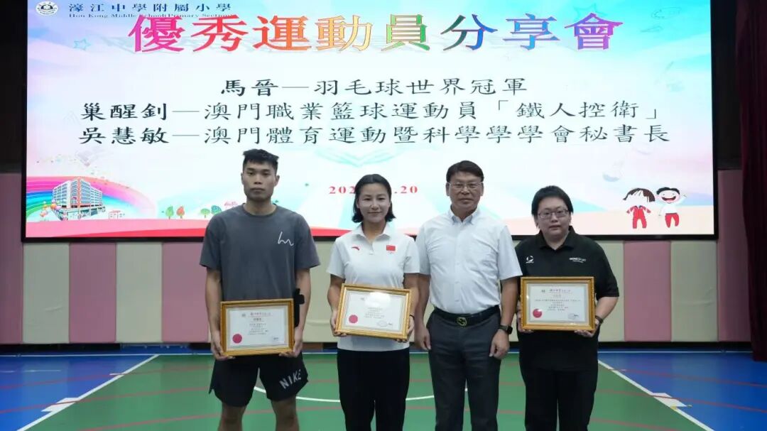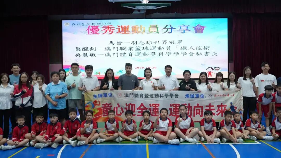 此次主題活動採取校園巡迴分享形式,走進濠江中學附屬小學校園。體科會特別邀請重量級嘉賓助陣:前國家隊羽毛球世界冠軍馬晉,以及澳門黑熊籃球隊球員巢醒釗。活動現場,兩位嘉賓不僅結合自身運動經歷,向同學們分享體育訓練的堅持與收穫,更開展親切互動環節 —— 馬晉現場示範羽毛球基礎動作,巢醒釗帶領學生體驗簡單籃球技巧,讓同學們近距離感受專業運動的魅力,現場笑聲與掌聲不斷。