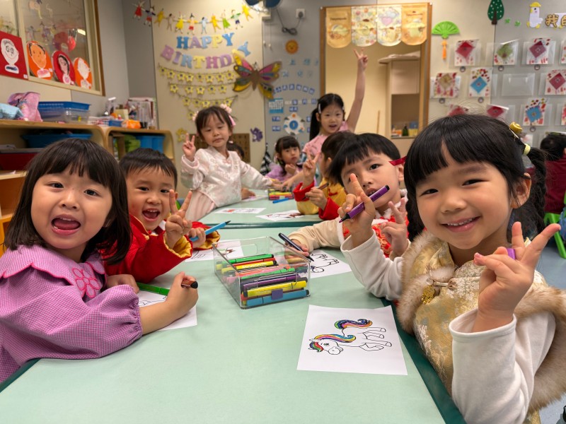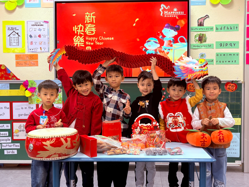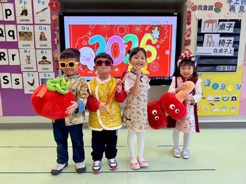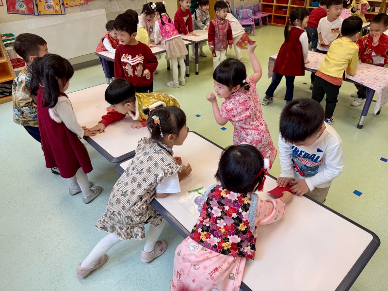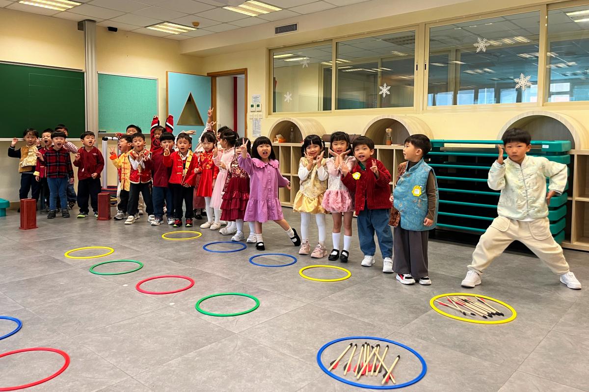 為延續新春歡樂,各班級紛紛舉辦新年慶祝活動。K1的小朋友在課室裡玩各種趣味遊戲,並親手製作馬年美勞作品;K2級舉辦「串門」活動,孩子們穿上華麗的傳統服飾,穿梭各班挑戰「百發百中」、「新年送福」等攤位;K3級則在小禮堂舉行慶祝活動,透過舞獅、對聯遊戲及「傳福袋」接力等遊戲,讓孩子們在歡樂中認識傳統文化。