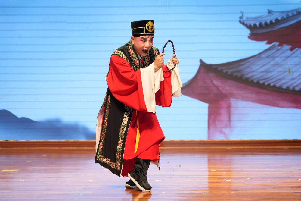 在每個選段表演之後,主持人還貼心地安排了學生互動環節,學子們積極踴躍,現場氣氛熱烈。同學們跟著17歲小生哥哥學耍花槍,向丑角哥哥學轉佛珠,向旦角姐姐學擺蘭花指和模仿開門動作,還模仿了羅漢叔叔 “讀書”、“酣睡” 的姿態和氣勢十足的“哈哈大笑”。台上同學熱情嘗試,台下同學同步跟學,笑聲、掌聲與喝彩聲不斷。活動結束時,同學們直呼“沒聽夠”,“好想學”。