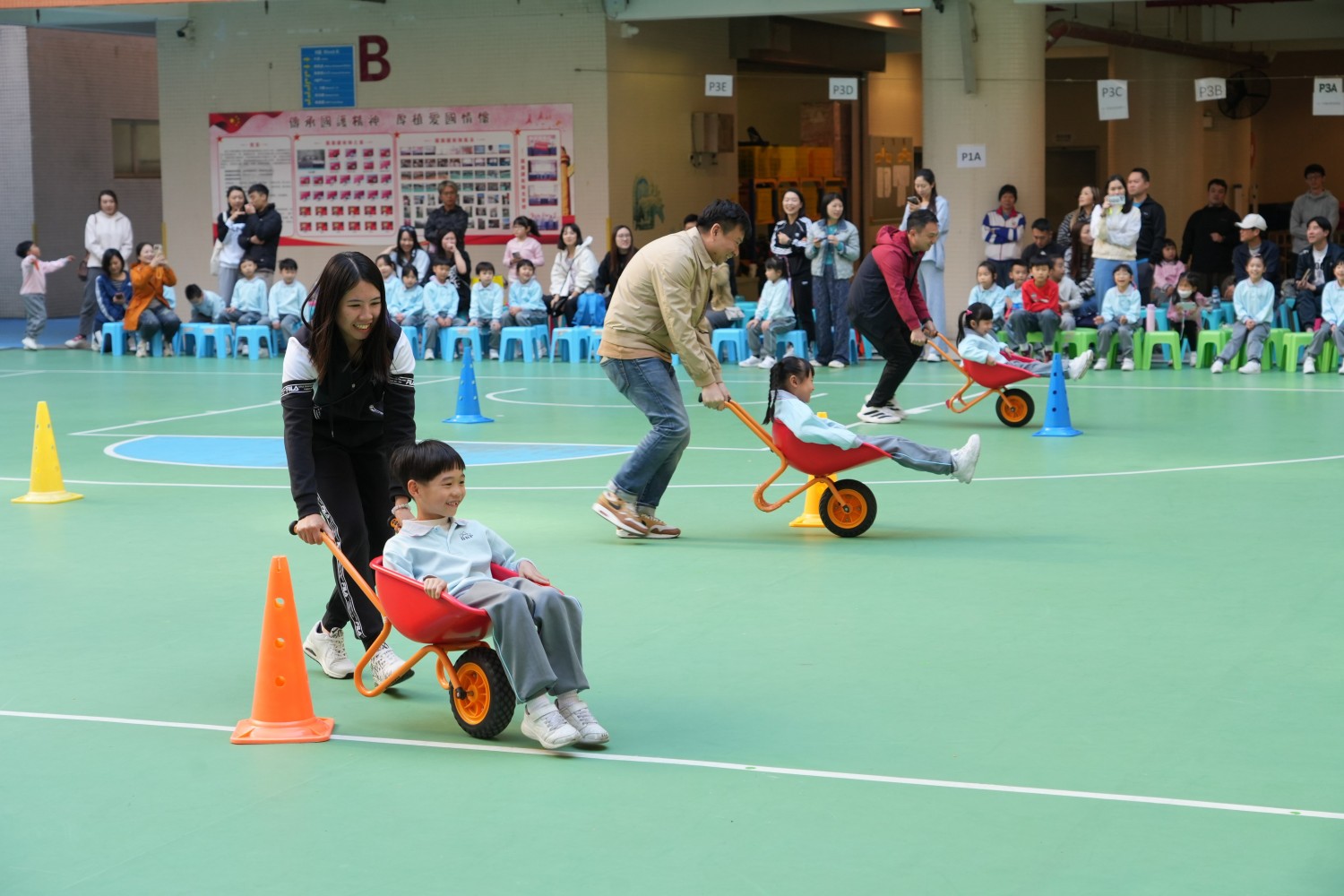 隨後的親子遊戲更是將全運精神落實到行動:《幸運輪運福娃》中,家長穩扶幸運輪小車推著孩子勇往直前;《齊心協力向前沖》裏,家長和孩子親密合作,步步為營;《蜻蜓點水》遊戲中大家排成長龍,配合默契... ...大家在歡笑中體悟 “同心才能共贏”,汗水與笑容在所有人臉上交織,溫暖的親子情在運動中悄然升溫。