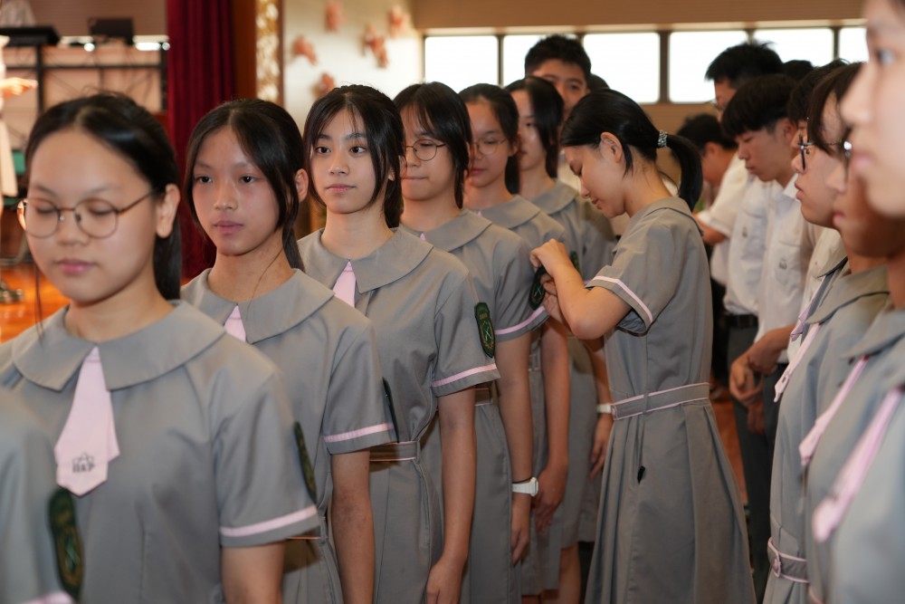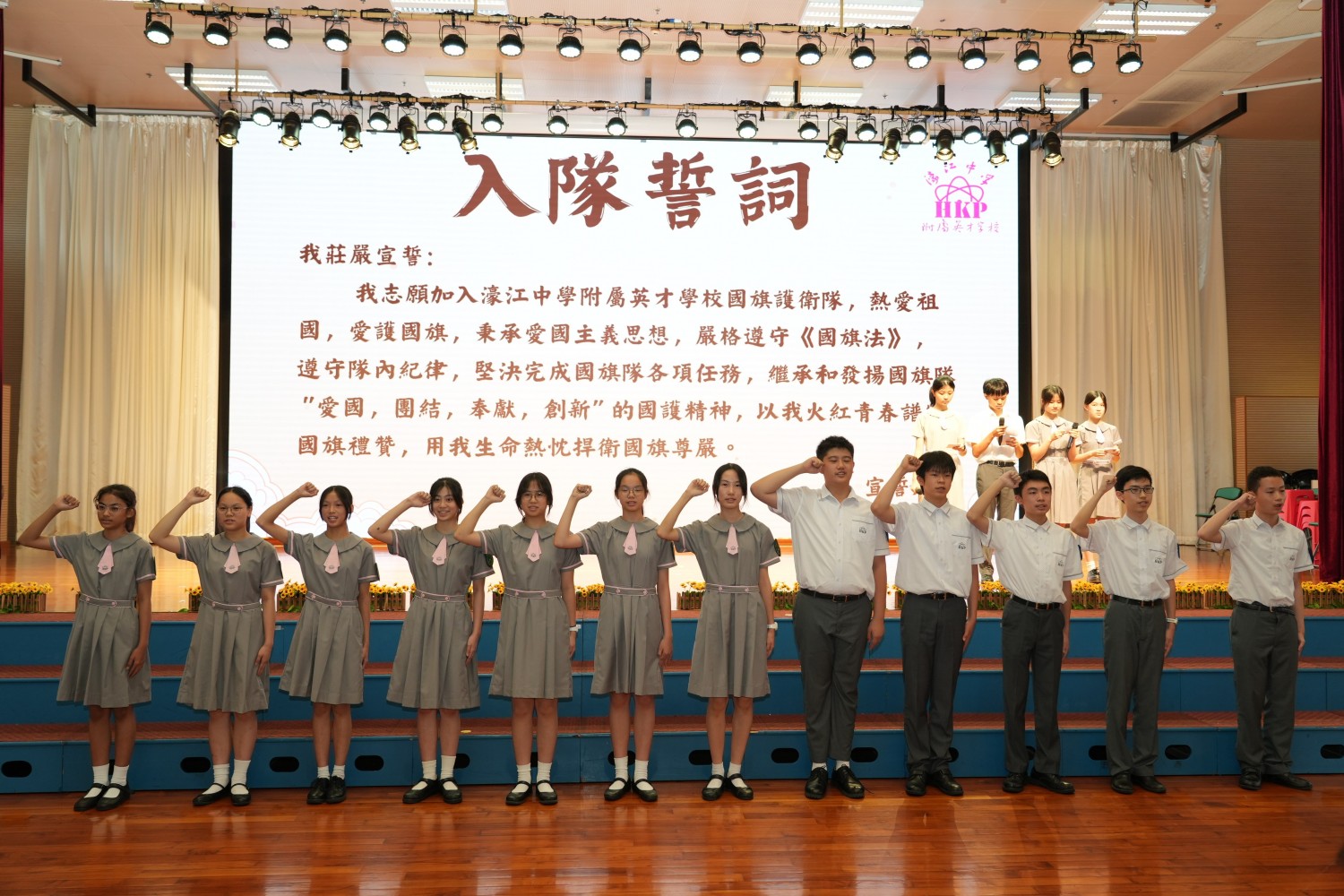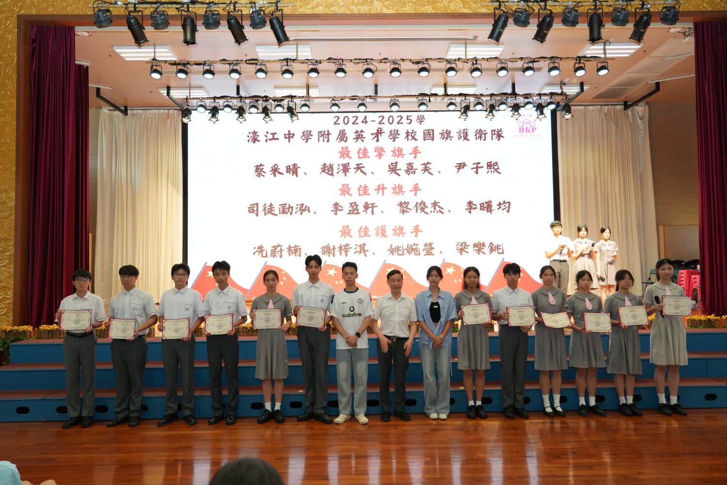 在全體師生的見證下,尤端陽校長為過去一年表現突出的隊員頒發獎狀,牛蘭珍副校長將隊旗交予新任隊長,完成換屆交接。十二名新隊員經過嚴格考核光榮入隊,並戴上由資深隊員親手傳遞的象徵光榮與使命的徽章。新一屆國旗護衛隊隊員莊嚴宣誓,以生命熱忱,捍衛國旗尊嚴。表達了他們對守護國旗的堅定決心,體現濠江兒女薪火相傳的愛國情懷,以青春名義向祖國獻上最深情的告白!