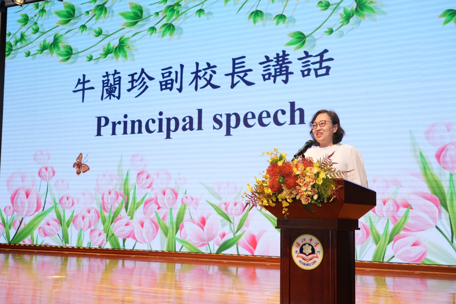 開學典禮上,濠江中學牛蘭珍副校長代表學校歡迎全體師生返校,勉勵師生深入學習歷史,傳承和弘揚抗戰精神,期望老師們潛心育人,同學們勤學奮進,將個人成長與國家發展緊密結合,共同為實現中華民族的偉大復興貢獻力量。
