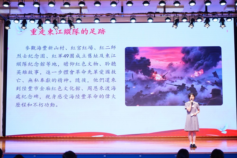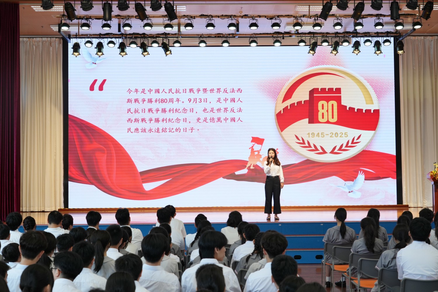 同場安排紀念中國人民抗日戰爭勝利八十周年主題宣講活動,由老師主持。中、小學學生分享暑期收穫,活動旨在引導師生銘記歷史、珍愛和平,將愛國之心轉化為報國之行,肩負起新時代賦予的責任與使命。