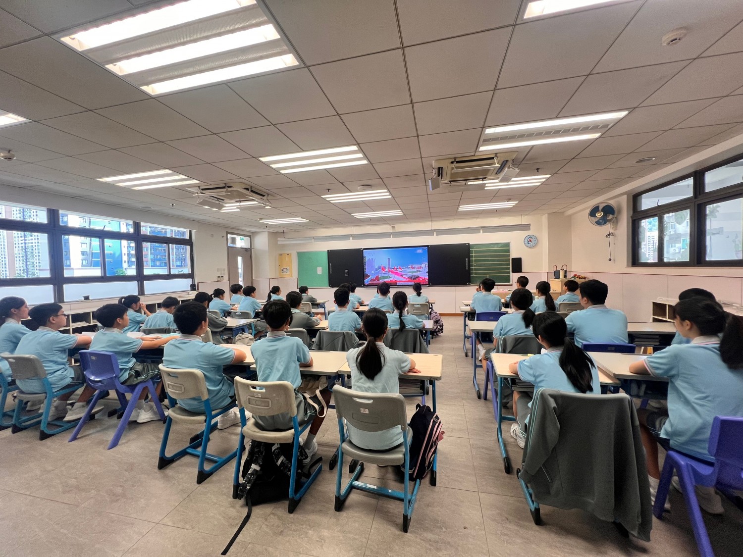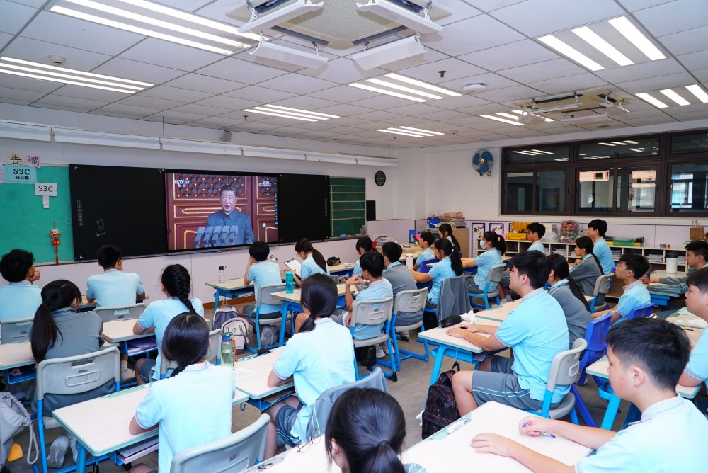 9月3日,澳門濠江中學附屬英才學校中小幼全體師生沉浸在莊重而熱烈的氛圍中,師生滿懷期待,準時通過直播觀看了“紀念中國人民抗日戰爭暨世界反法西斯戰爭勝利80周年大會”,校園裡激蕩著振奮人心的歡呼。