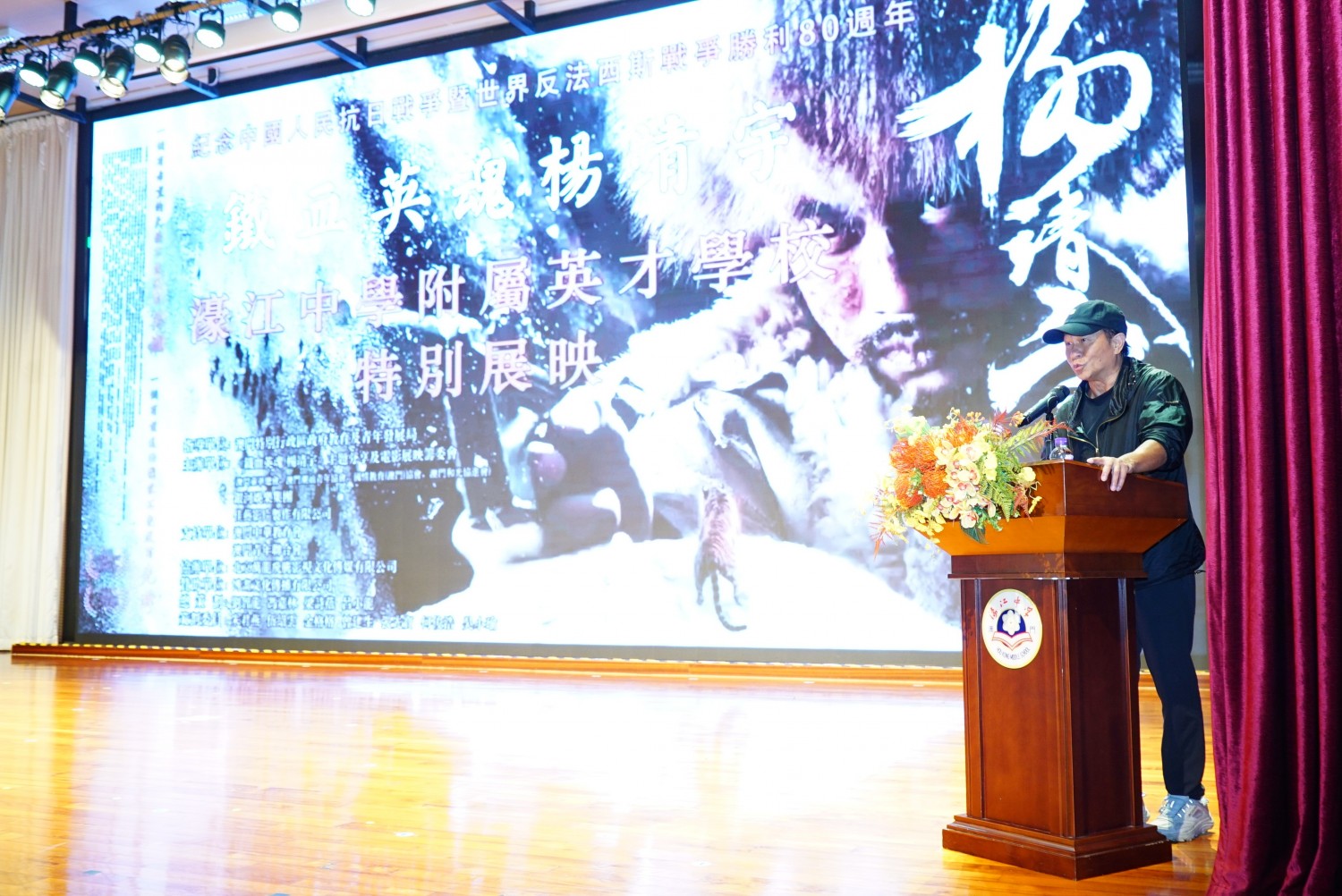 為紀念中國人民抗日戰爭暨世界反法西斯戰爭勝利80周年,引領師生銘記歷史、珍愛和平,在9月30日烈士紀念日,電影《鐵血英魂楊靖宇》展映活動走進濠江中學附屬英才學校,為中小學全體師生帶來一場別開生面的愛國主義教育活動。出席本次活動的嘉賓有導演呂小龍先生、製片人朱君燕小姐、澳門湖南總商會汪副會長、濠江中學家長會周謐副理事長,本校行政有尤端陽校長、陳步倩副校長和牛蘭珍副校長。