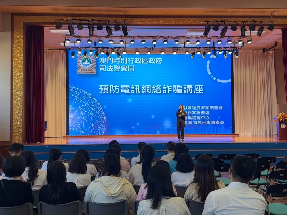 為加強校園防罪宣傳,10月9日,澳門司法警察局代表蒞臨濠江中學附屬英才學校,為中小幼教師舉辦預防電信網絡詐騙專題講座,透過真實案例與專業分析,提升教師對常見電信網絡詐騙的認知及應對能力,進一步築牢校園防騙防線。