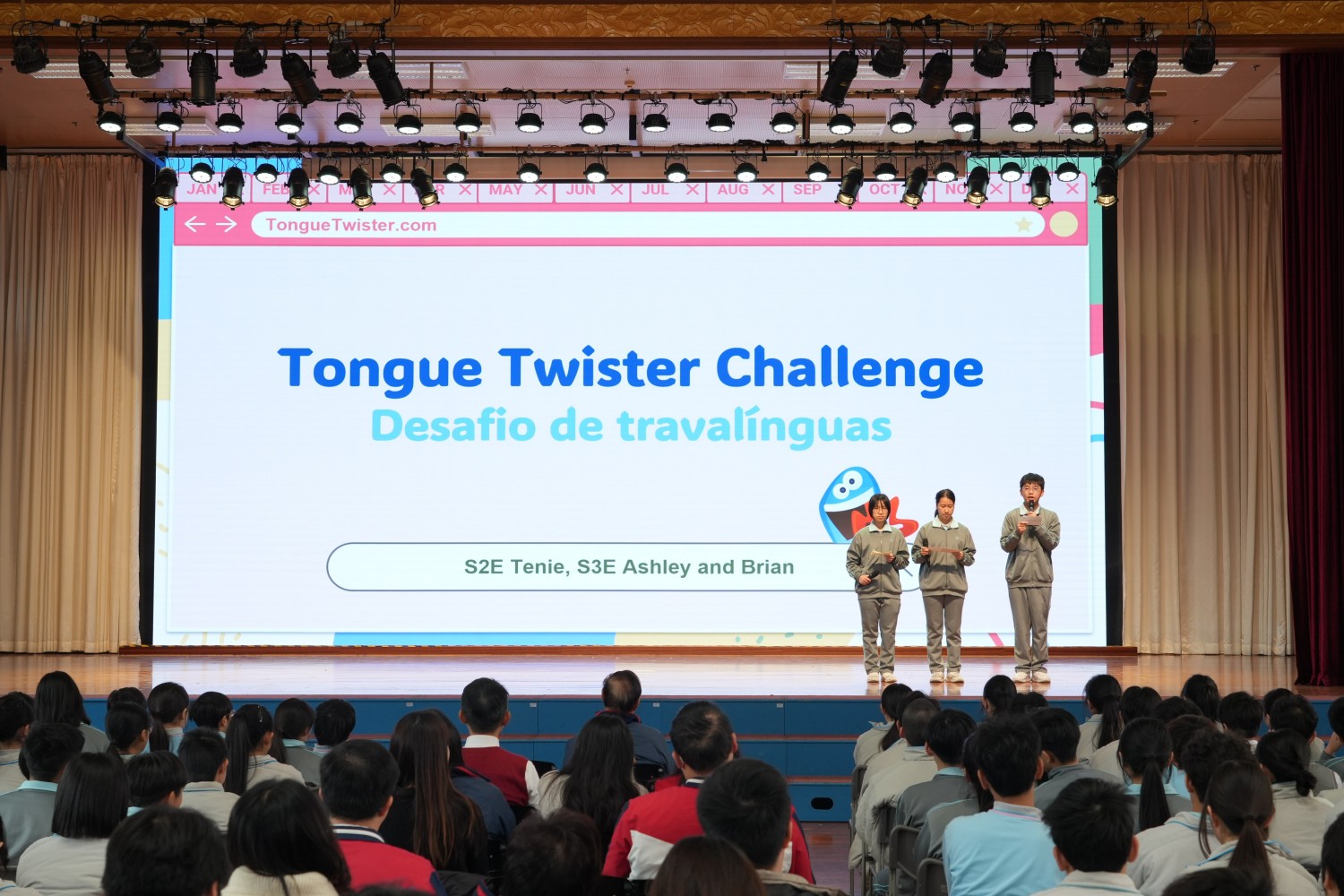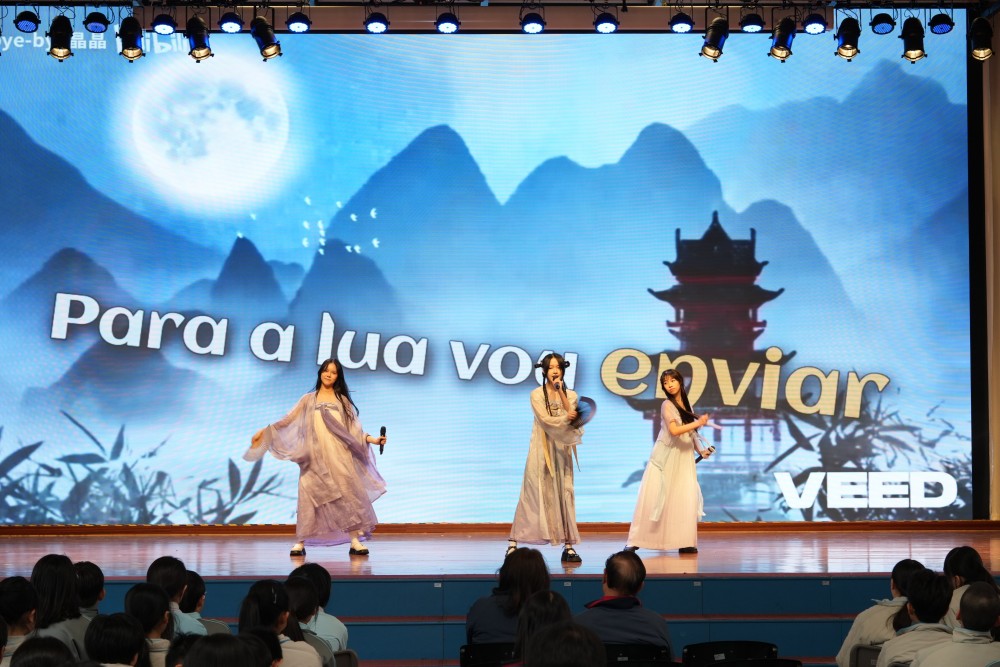 本次周會節目豐富多元,同學們以自製的葡語Vlog拉開序幕,用生活化視角展示語言學習成果;隨後的葡語歌曲演唱《Onde irei ter》、師生合作表演《O céu é infinito》及唱跳表演《À luz da lua》,以藝術形式傳遞了語言之美。英文演講圍繞“鼓勵學生參與體育運動”展開思辨,而別開生面的“葡英急口令挑戰”則將現場氣氛推向高潮,考驗了同學們的語言熟練度與反應能力。壓軸的澳門葡文知識問答環節,更是加深了全體同學對澳門本地文化特色與國際聯繫的理解。