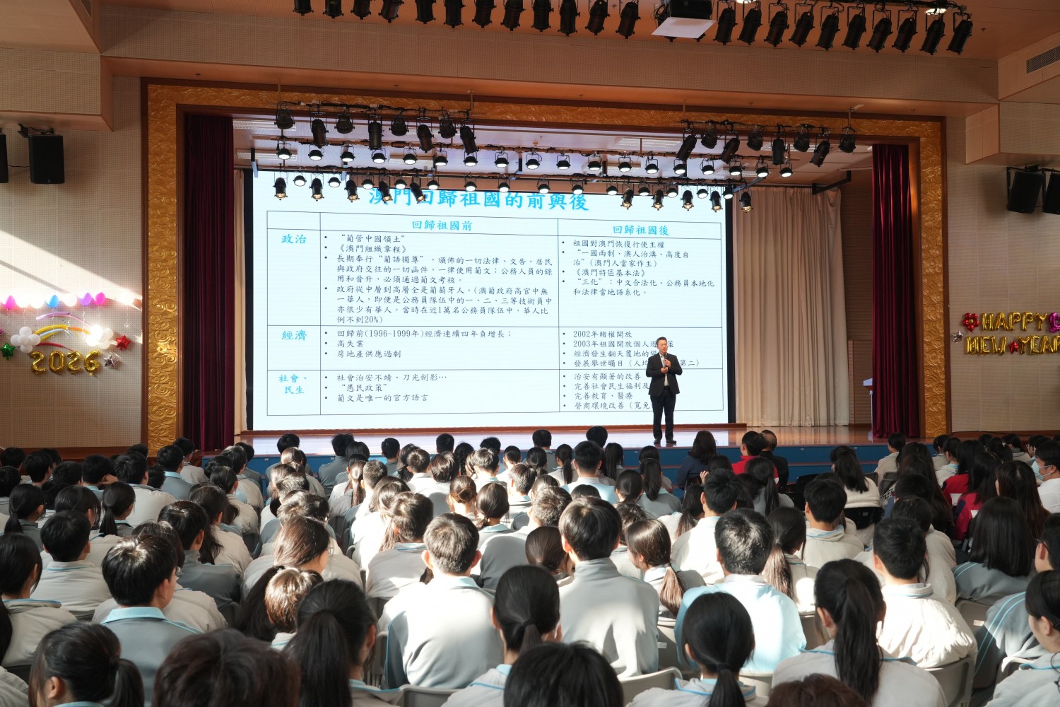 講座中,柳智毅博士以豐富的圖像與數據,生動對比澳門回歸前後的城市面貌與經濟社會發展。透過一幅幅今昔對比的照片,同學們直觀感受到回歸二十六年來,澳門在城市建設、公共設施及民生品質等方面的顯著提升。柳博士進一步以具體經濟數據說明,自1999年回歸以來,澳門本地生產總值大幅增長、人均收入持續上升,整體經濟實現跨越式發展,社會保持繁榮穩定。這些鮮活的對比,讓學生深刻體會到「一國兩制」方針的成功實踐與國家支持對澳門發展的關鍵作用。