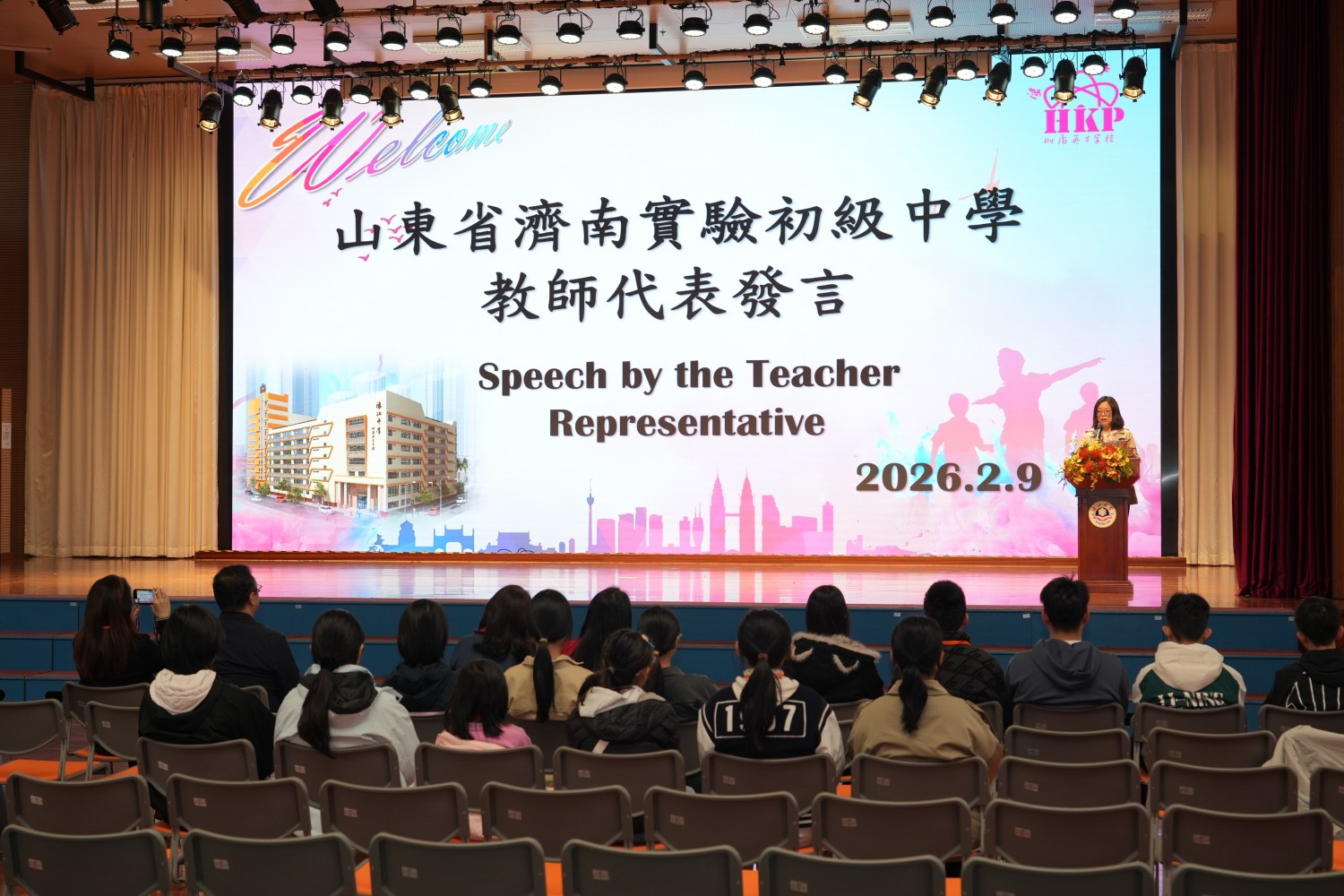 下午2時30分,濠江英才學生會代表在校門口熱情迎接姊妹學校師生,並引導至禮堂舉行歡迎儀式。中共山東省濟南實驗初級中學第一支部委員會書記、語文教研組組長黃淼,著名青少年教育專家溫學琦,山東藍帶國際教育董慶芬主任、于千子副主任以及濠江中學牛蘭珍副校長出席本次活動。