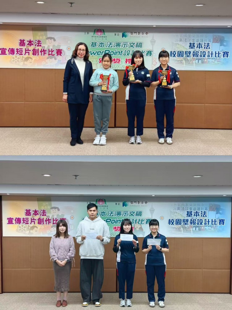 為慶祝中華人民共和國成立76周年、澳門特別行政區成立26周年,進一步在校園推廣《憲法》及《基本法》知識,由澳門基本法推廣協會主辦、澳門基金會贊助的“基本法校園壁報設計比賽”順利舉辦。活動吸引澳門多所中小學踴躍參與,經評委專業評審、嚴格篩選,濠江英才P6C班的參賽作品憑藉鮮明的主題立意、新穎的創作構思,以及扎實的基本法知識呈現,脫穎而出榮獲小學組一等獎,該班指導老師梁嘉杰亦獲頒指導老師獎。